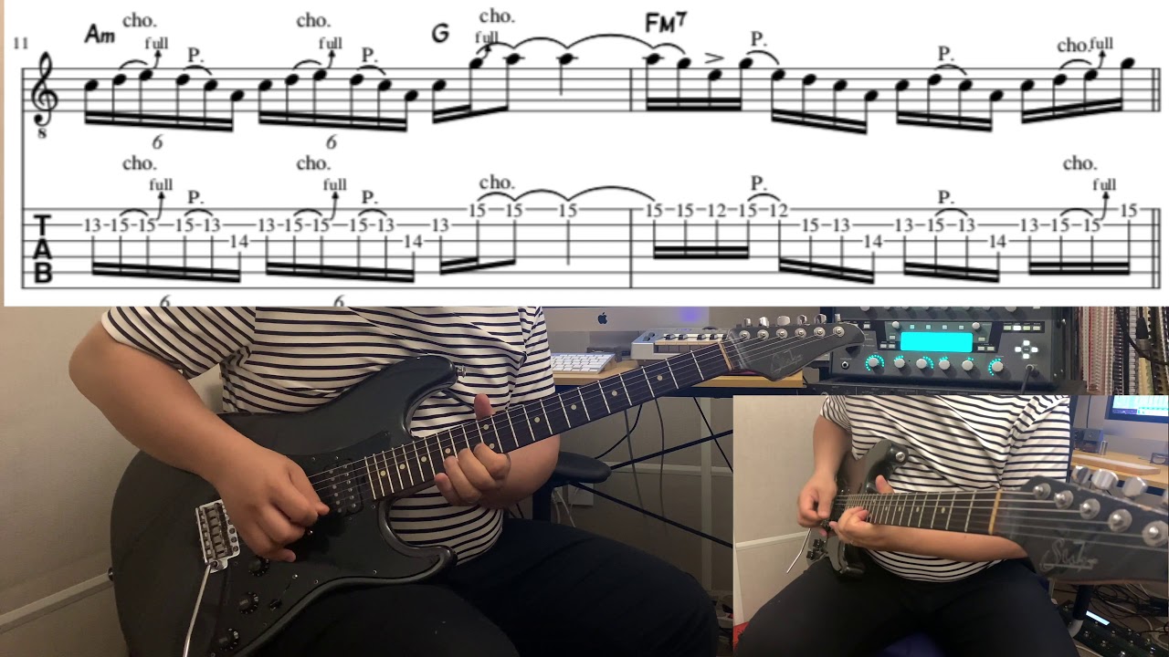 Ok this is where the solo starts. Am - x02210 I'll include the chords to play over Am7 - x02010 it they sound pretty open I think Fmaj7 - xx3210 its a 12 string. The two guitars continue into this section. Walloping (a technical term meaning hit very hard &) the strings using the full barre sounds pretty good. The lead basically follows the bass.
