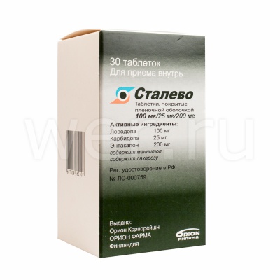 Цена на Сталево от 3 865 руб . Забронировать Сталево можно в аптеке Wer в Москве Orion Pharma [Орион Фарма] Сталево таблетки покрытые пленочной оболочкой 150 мг+37,5 мг+200 мг 100 шт . Уведомить Orion Pharma [Орион Фарма] Сталево таблетки покрытые пленочной оболочкой 50 мг+12,5 мг+200 мг 30 шт . Последняя цена: 3 865 Уведомить