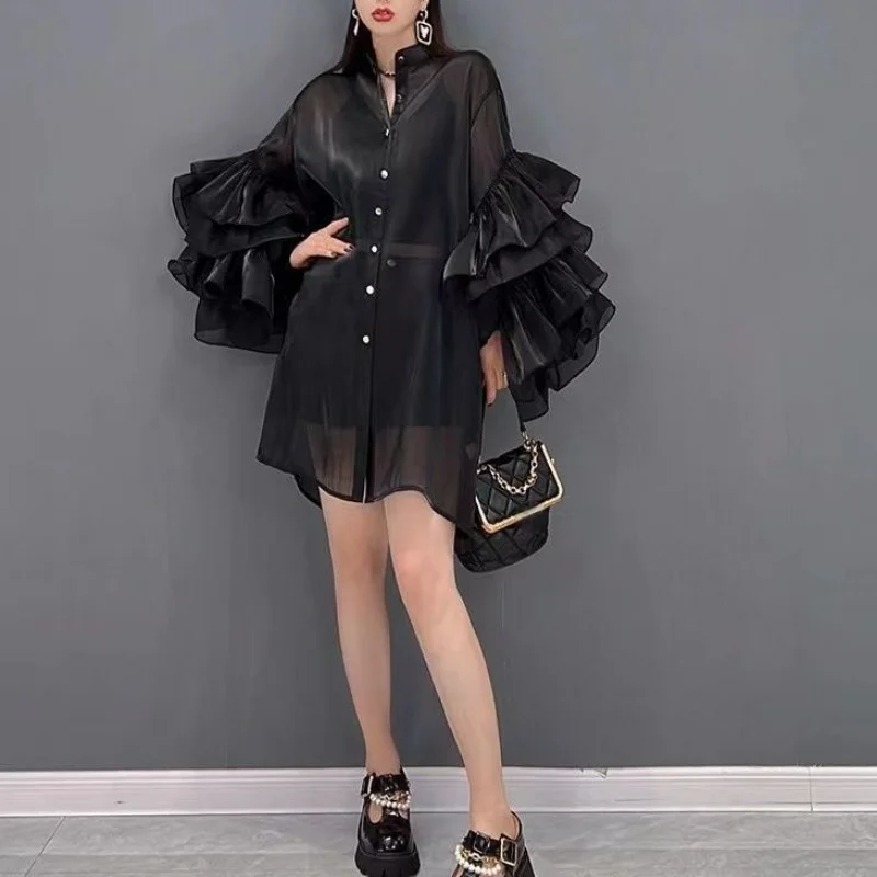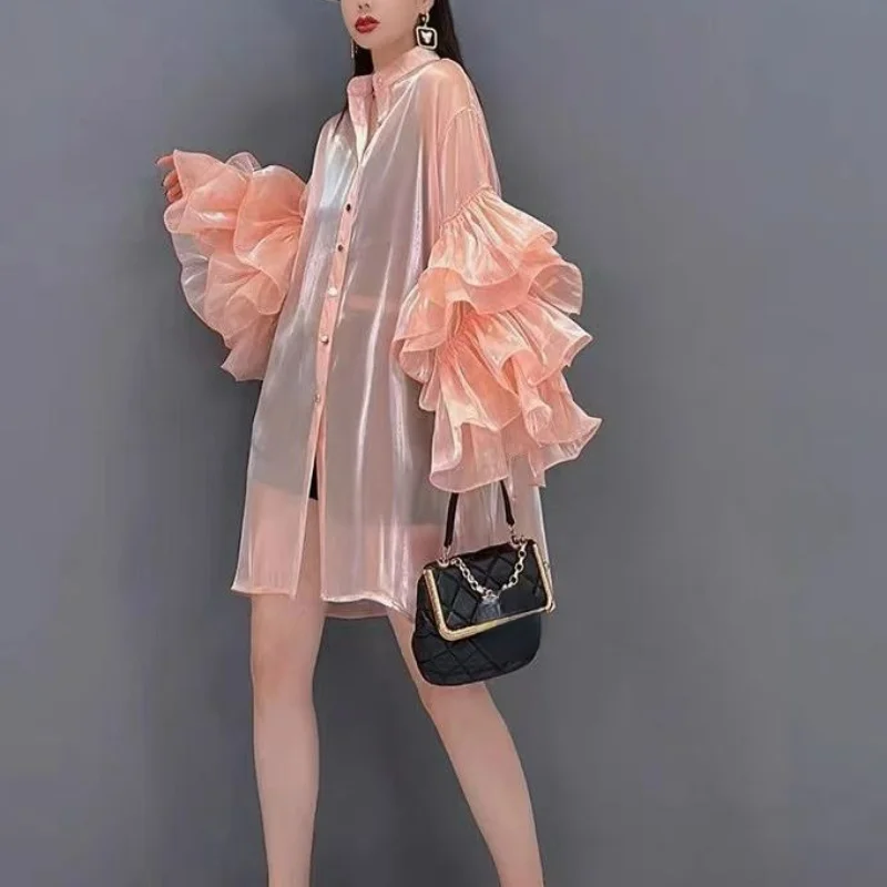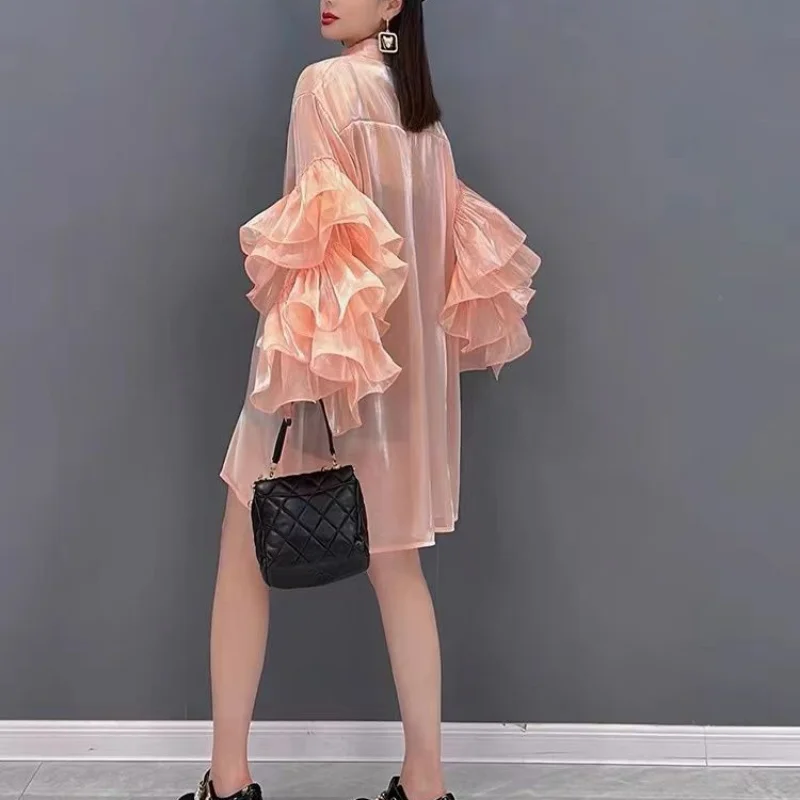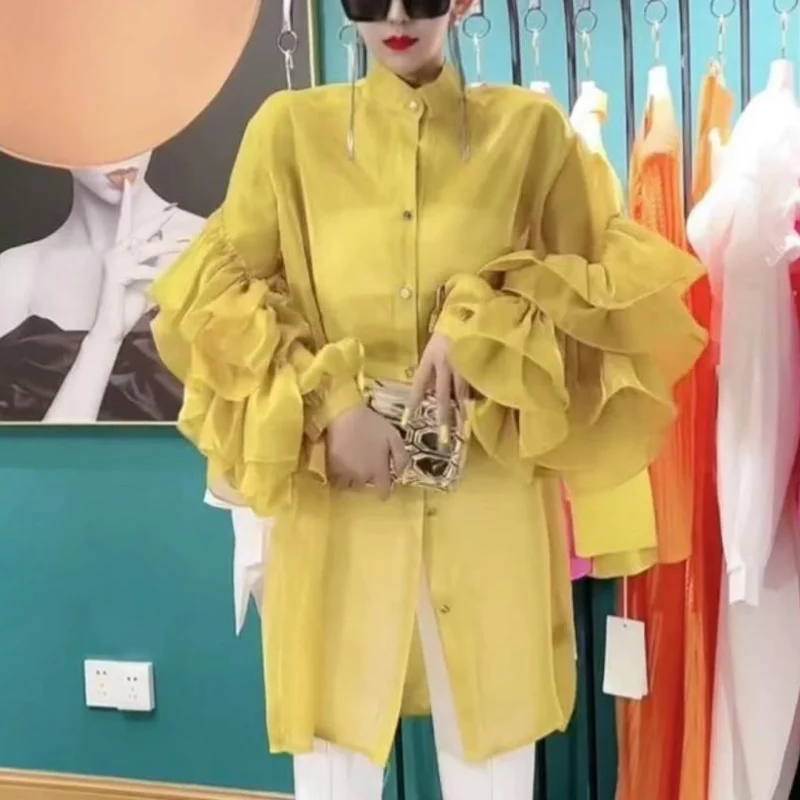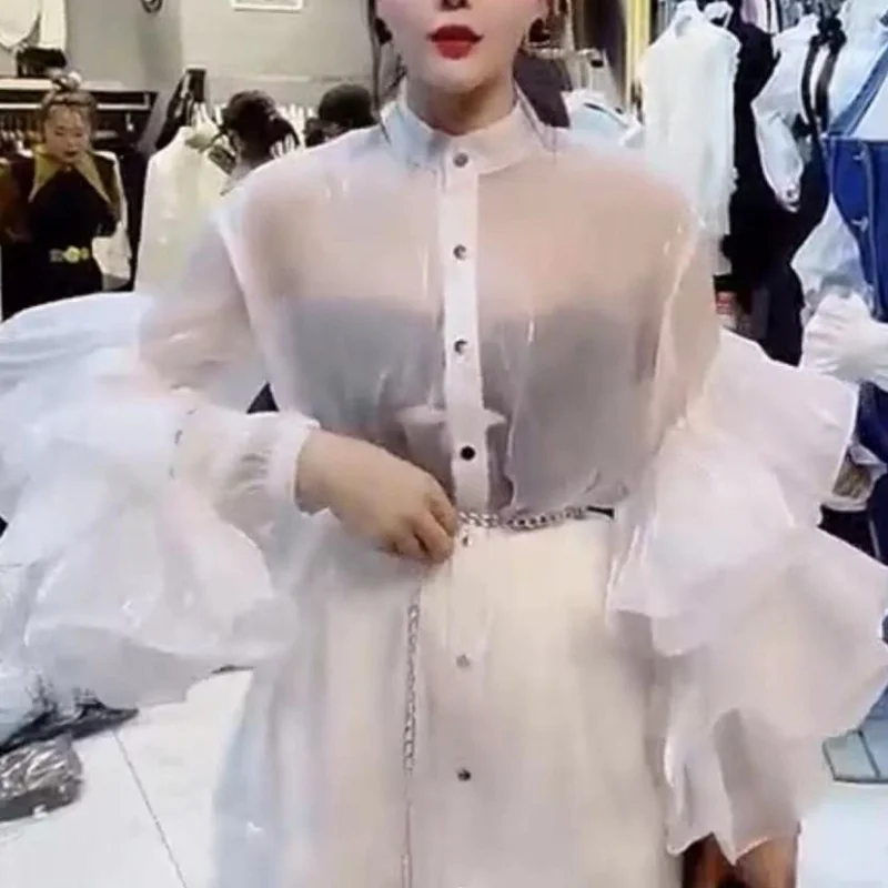 pvYmqjZnVHHere you can buy Stand Neck Solid Color Long Sleeve Ruffles Shirts Single-breasted Slightly Transparent Blouses Summer High-End Chiffon Blusas with free delivery to your post office.