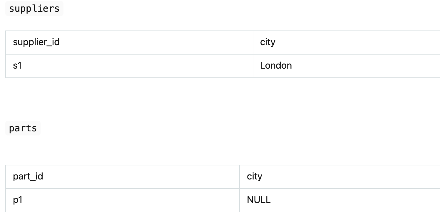Однако мы знаем, что неизвестный город либо Париж, либо не Париж. Если это Париж, то первое условие будет истинным (<> 'London'). Если это не Париж, то истинным будет второе условие (<> 'Paris'). Таким образом, условие WHERE должно быть true, но оно им не является, и в результате SQL генерирует логически невозможный результат.