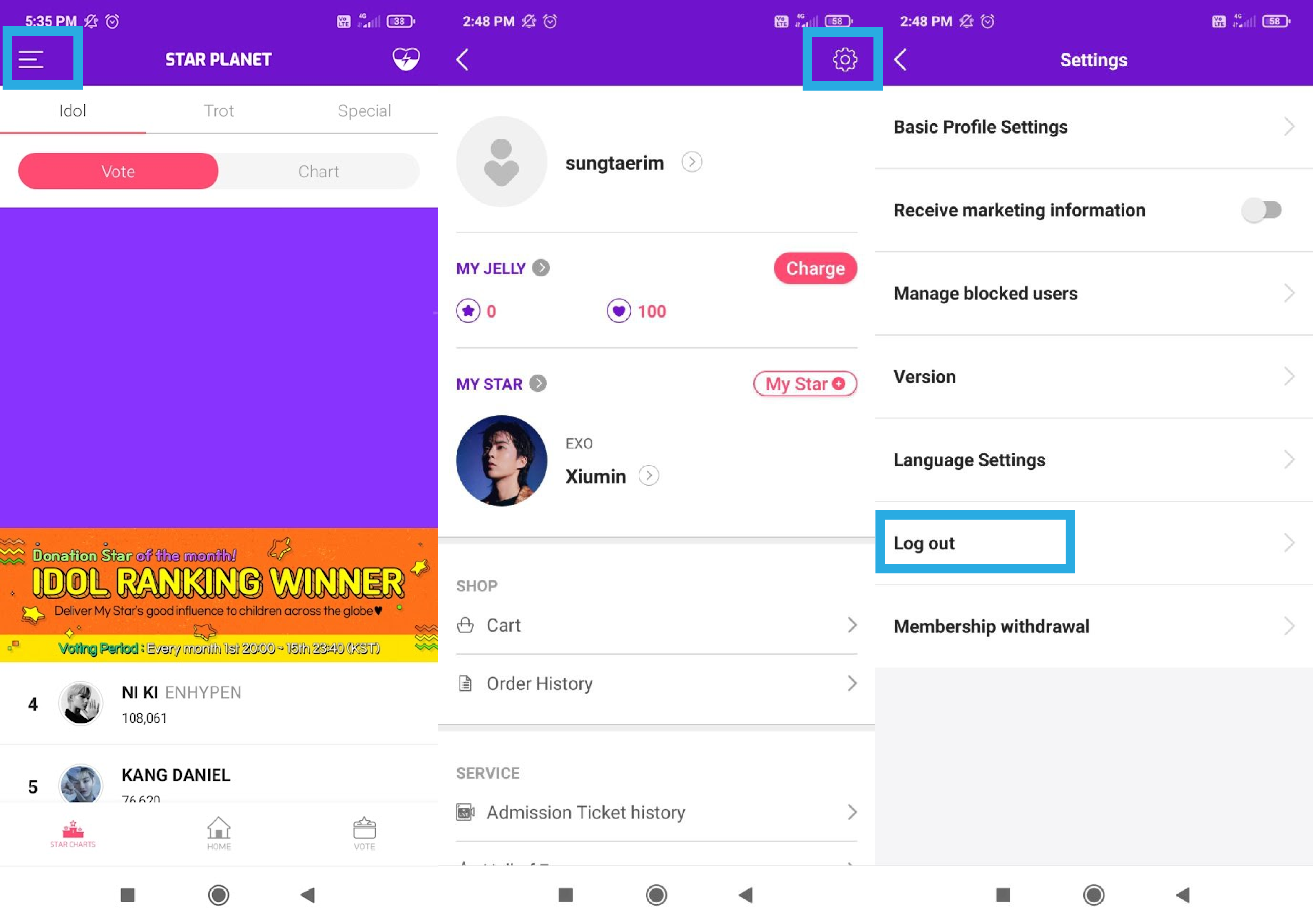 Зайдите в настройки, затем "My Star". В списке найдите EXO, а затем мембера и подтвердите выбор. Сменить айдола можно в любое время.