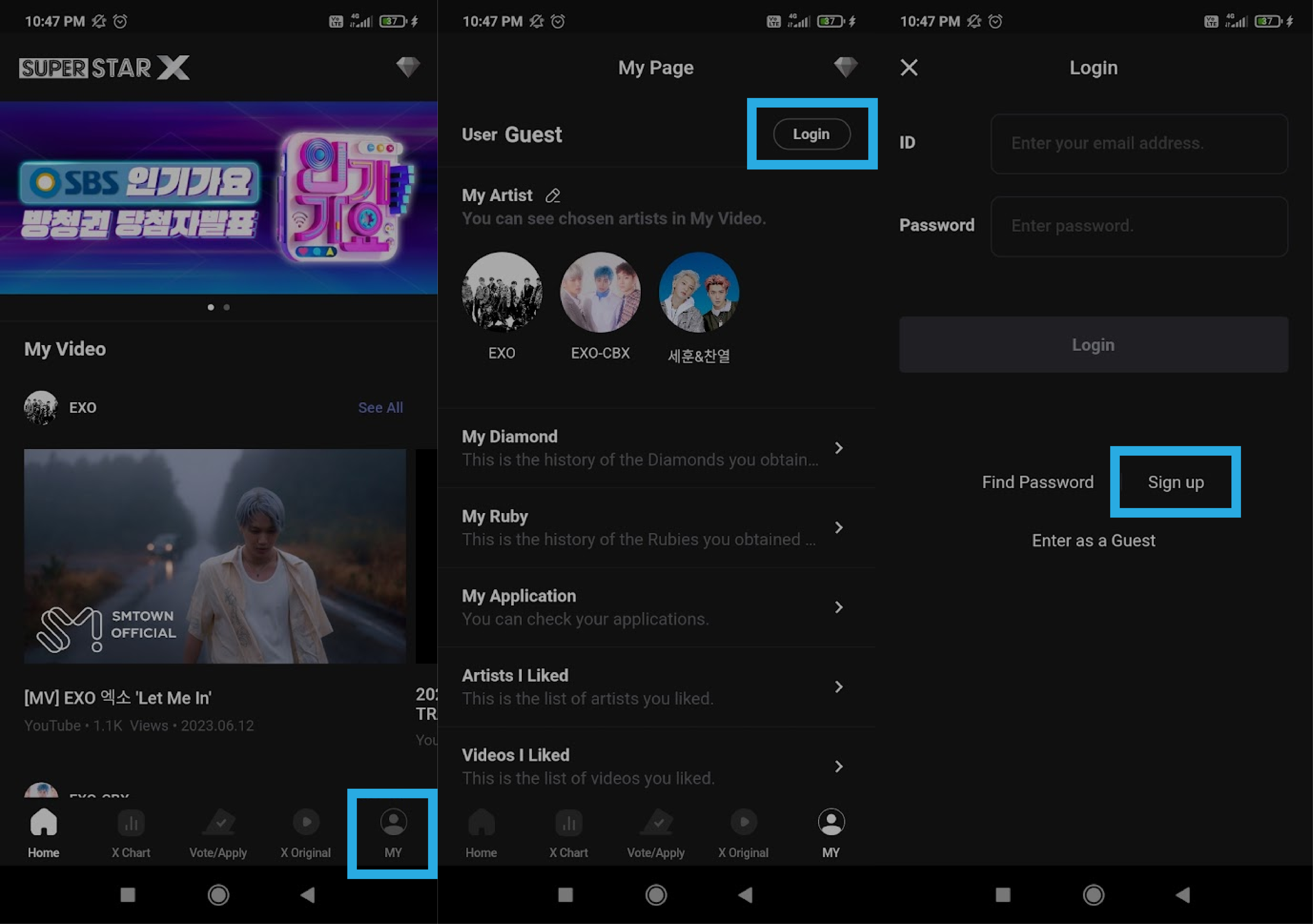 Перейдите на вкладку "MY", затем нажмите "Login". Если у вас уже есть аккаунт, введите данные и переходите к следующему разделу. Если у вас нет аккаунта, нажмите "Sign up".