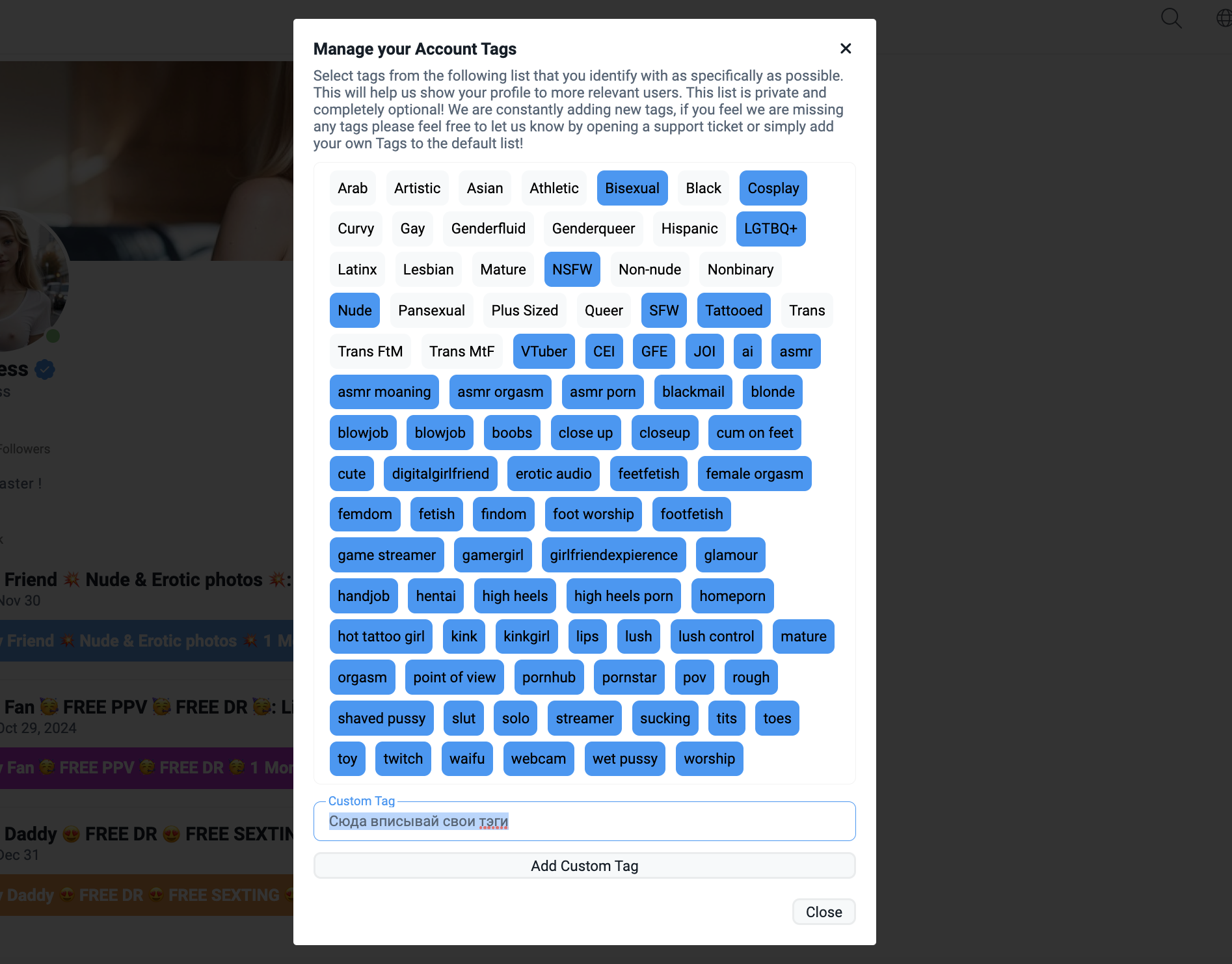В появившемся окне выбери тэги, которые максимально относятся к тебе и твоему контенту, а также напиши собственные в строке “Custom Tag”. Пиши по одному тэгу и обязательно нажимай на кнопку “Add Custom Tag”.