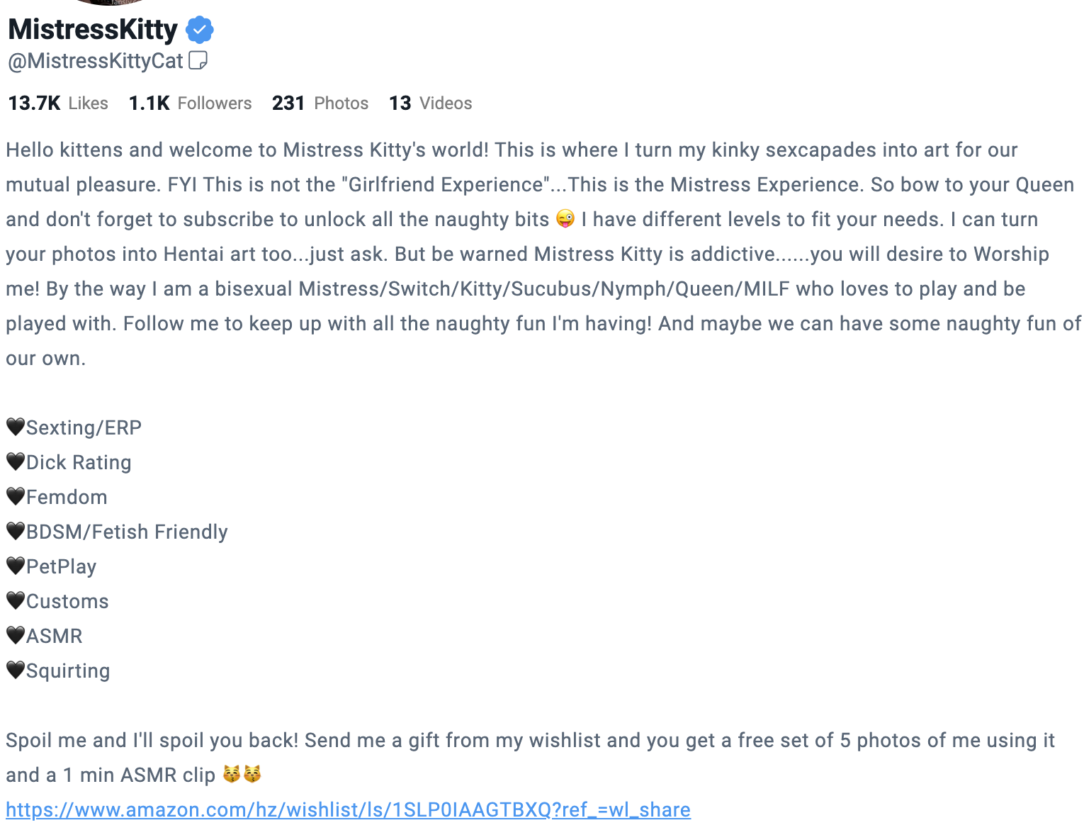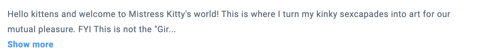 Описание профайла расположено сразу под аватаром. В этом разделе нужно написать о себе, о своём контенте и разместить ссылки, например на стартовый пост с TIP Menu или Custom menu. Также, многие модели, публикуют ссылки на свои виш-листы на Amazon.