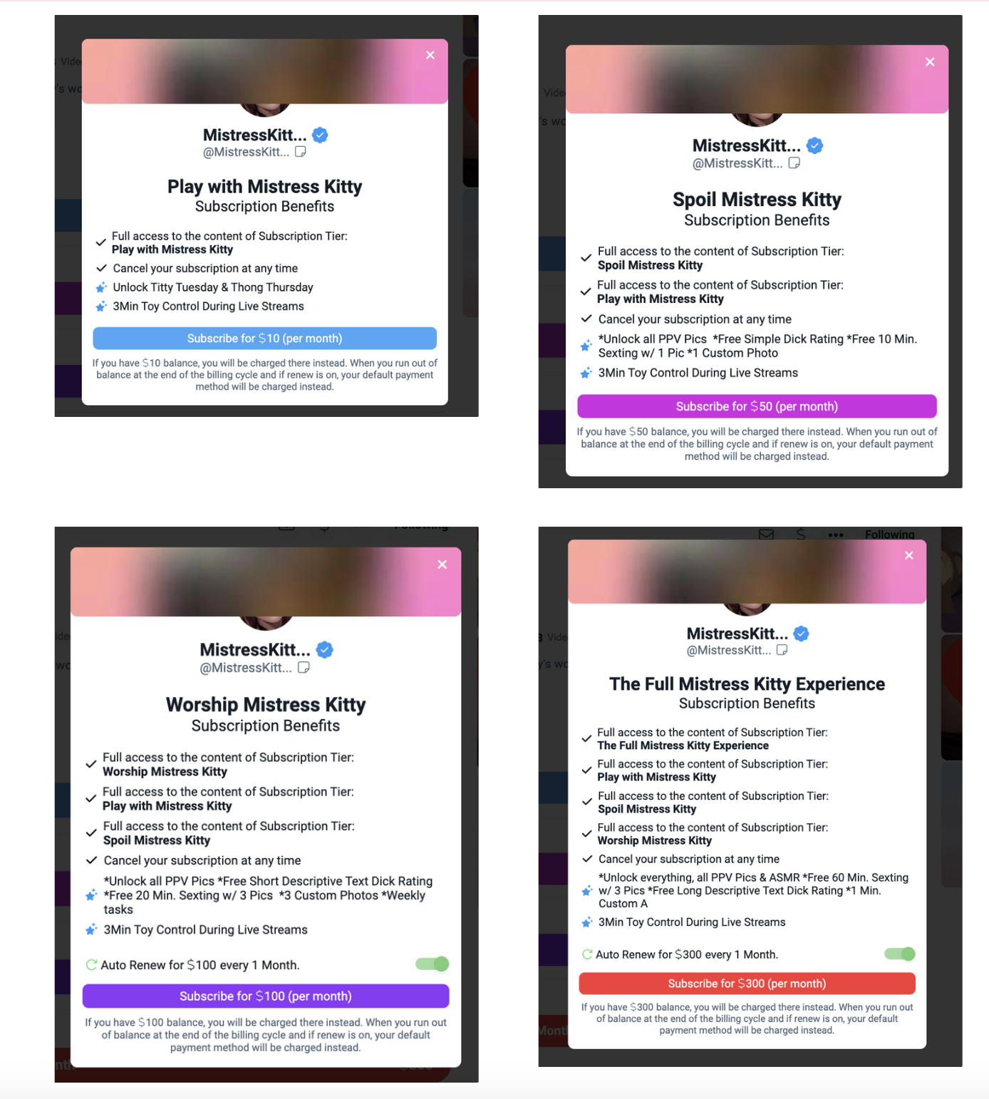 Уровни подписок могут быть совершенно разными, но, пока ты нераскрученная модель, не стоит ставить высокий прайс. Можно начать с малого и затем постепенно повышать цены и/или переводить мемберов на другие, более высокие уровни подписки.