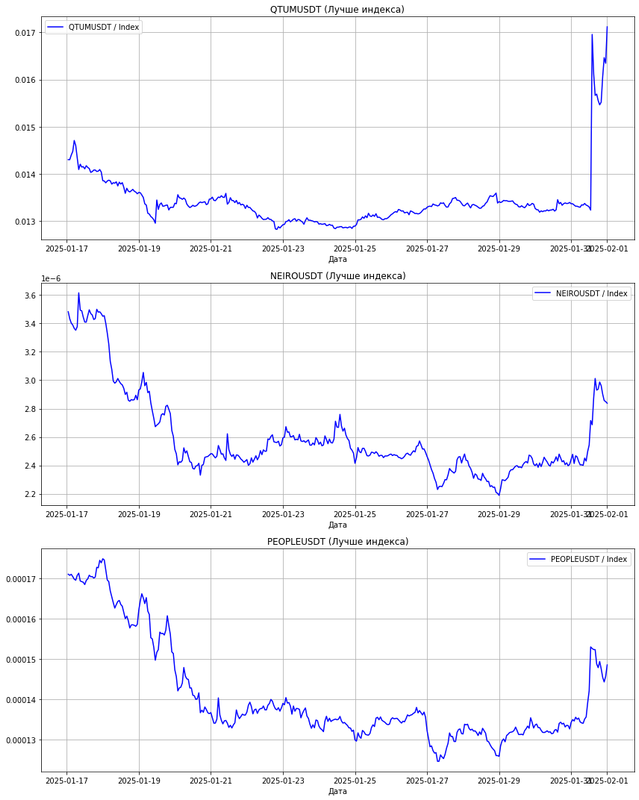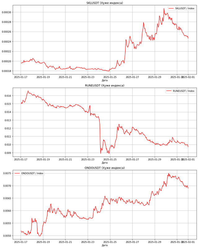 Результаты визуализируются в виде графиков спреда отношения цены монеты к индексу за последние 15 дней. Это позволяет наглядно оценить динамику относительной доходности активов. Лучшие и худшие монеты отбираются на основе ускорения их доходности или падения относительно индекса, что помогает выявить перспективные или проблемные активы.