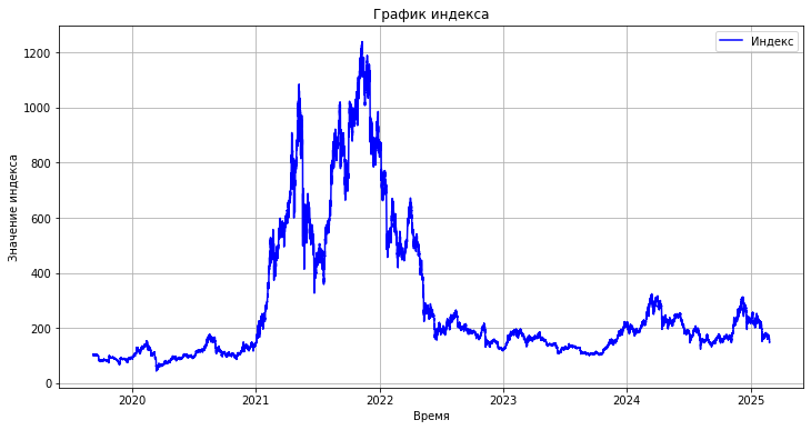 Индекс формируется как среднее значение стоимости инвестиций по всем отобранным монетам на каждый момент времени. Результаты сохраняются в CSV-файл и визуализируются в виде графика. Алгоритм позволяет создать инструмент для анализа рыночной динамики и сравнения доходности стратегий, фокусируясь на активах с высоким кредитным плечом.