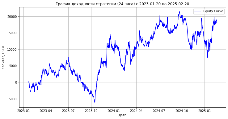 Результаты бэктеста визуализируются в виде графика изменения капитала, что позволяет оценить эффективность стратегии за указанный период (с 20 января 2023 года по 20 февраля 2025 года).