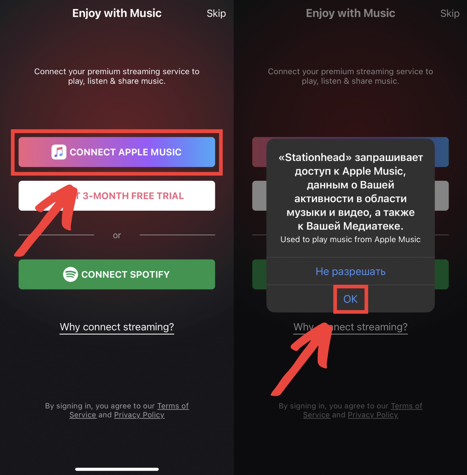 Если у вас подписка на Apple Music, всё то же самое, но нажать нужно на «Connect Apple Music», а затем на «OK».