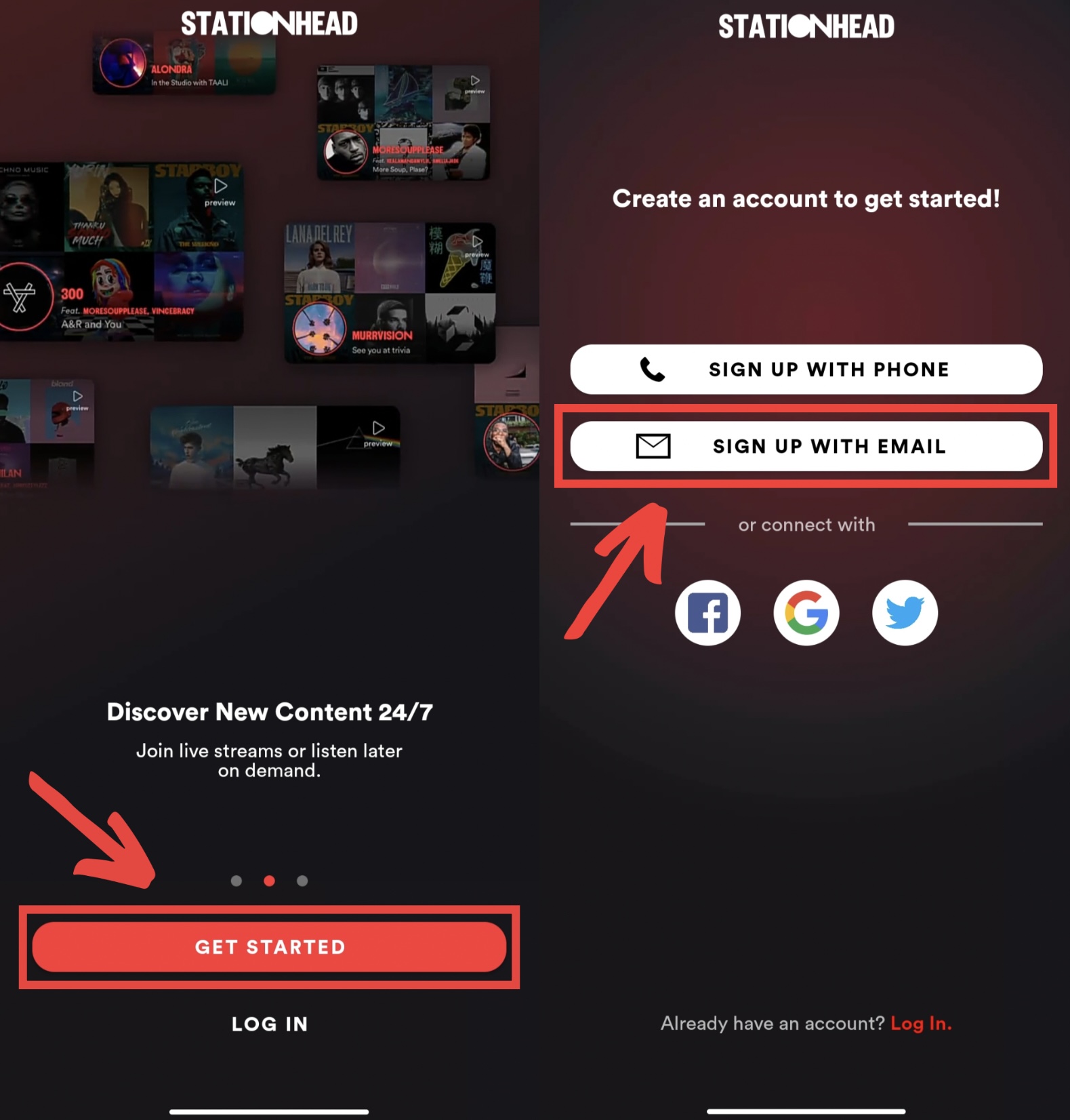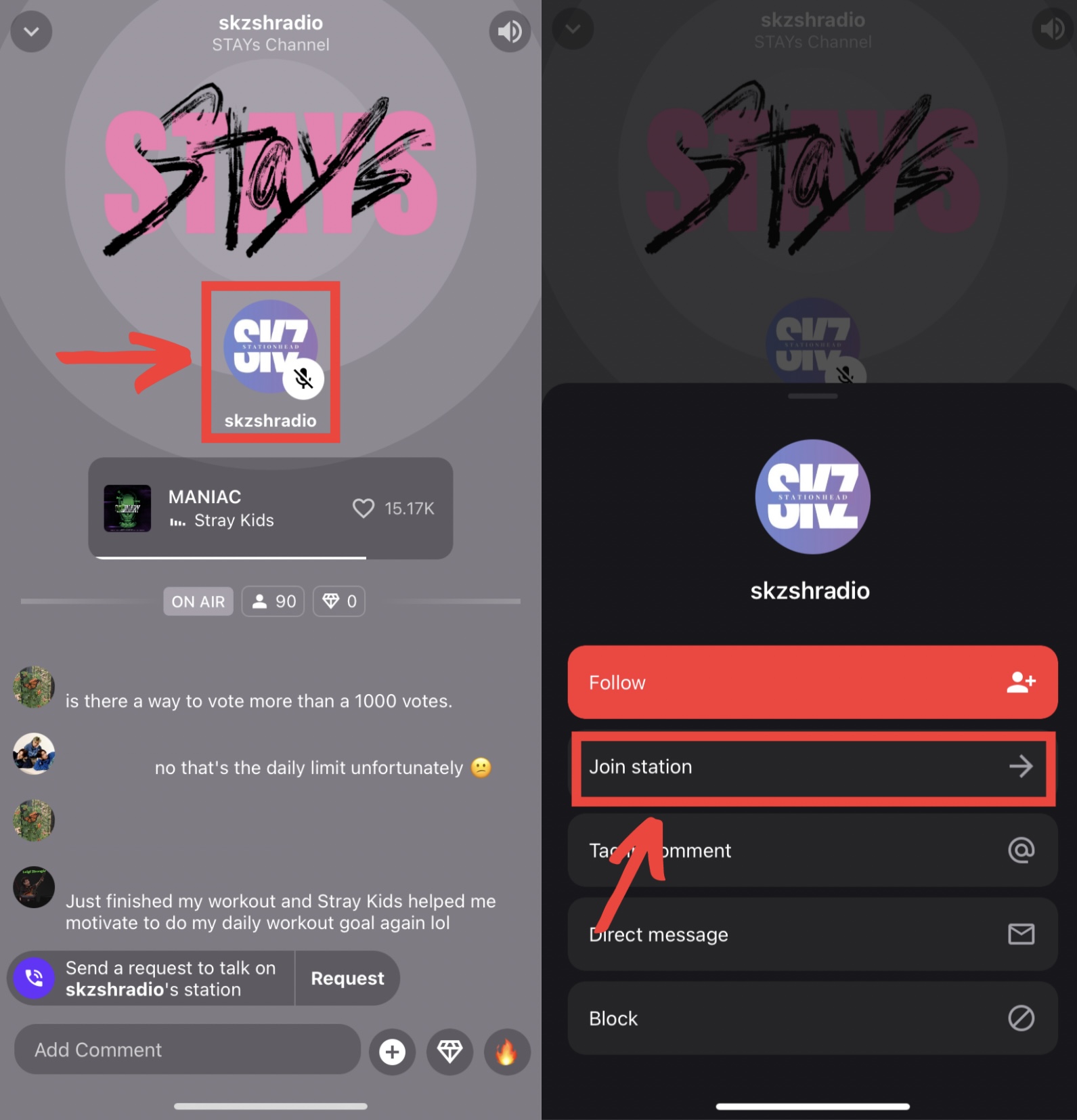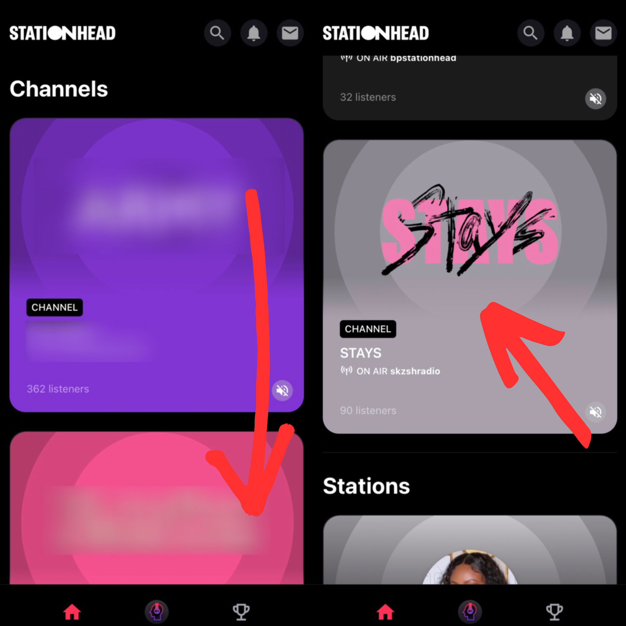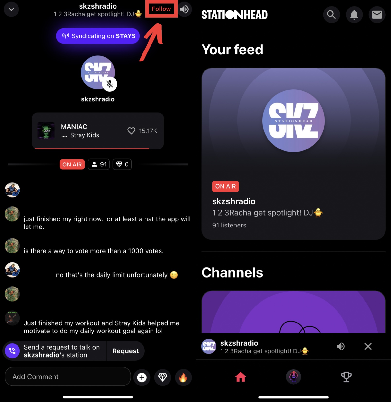 Если у вас есть действующая подписка на Apple Music или оформлена премиум-версия Spotify, для вас есть ещё один способ стриминга – приложение Stationhead. Оно работает почти как радио: вы заходите в приложение, подключаетесь через свой Spotify или Apple Music, присоединяетесь к каналу STAYS/одной из станций stay и слушаете музыку. Не нужно создавать или искать плейлисты, переключаться между ними и следить за их окончанием, ведущие станций делают всё за вас, а все стримы, заработанные таким способом, учитываются.
