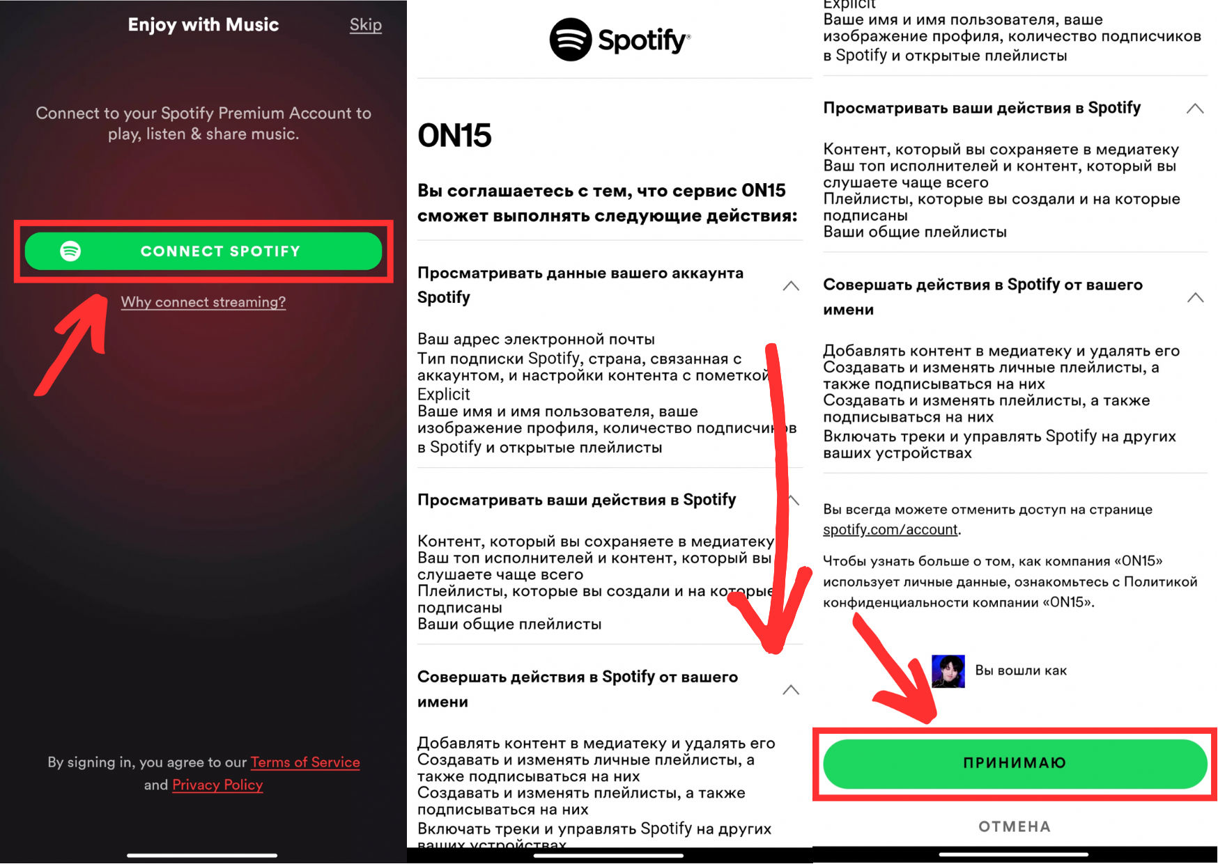 3. Если у вас есть премиум подписка на Sporify, сталось присоединить ваш аккаунт к учётной записи Spotify. Для этого нажмите на «Connect Spotify», пролистайте страницу вниз и нажмите на «Принимаю». Чтобы присоединение прошло успешно, необходимо войти в свой аккаунт Spotify в приложении Spotify. Если не работает, проверьте, в том ли вы аккаунте, и войдите в него ещё и в браузере.