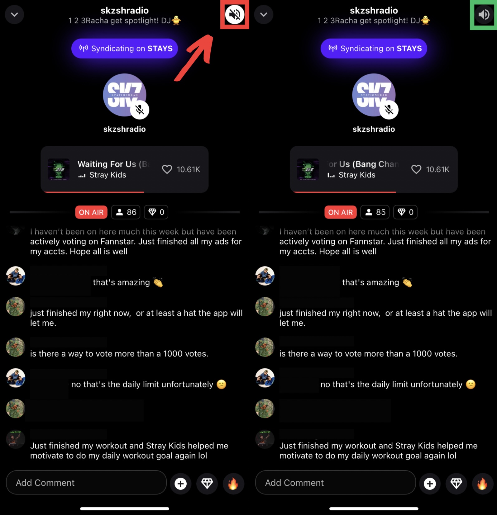 - Параллельно нельзя смотреть видео, слушать и записывать голосовые и т.д. Если вам придётся что-то из этого сделать, звук от станции выключится и дальнейшие стримы учитываться не будут. Чтобы их восстановить, зайдите в приложение и эфир станции и нажмите на кнопку включение звука в правой верхней части экрана. Она должна стать как на второй половине изображения.