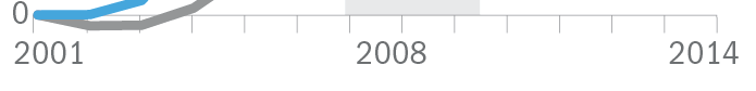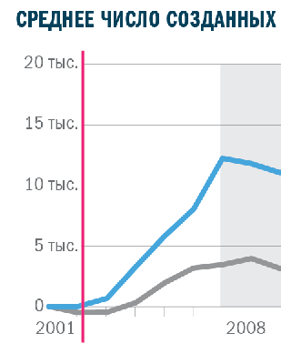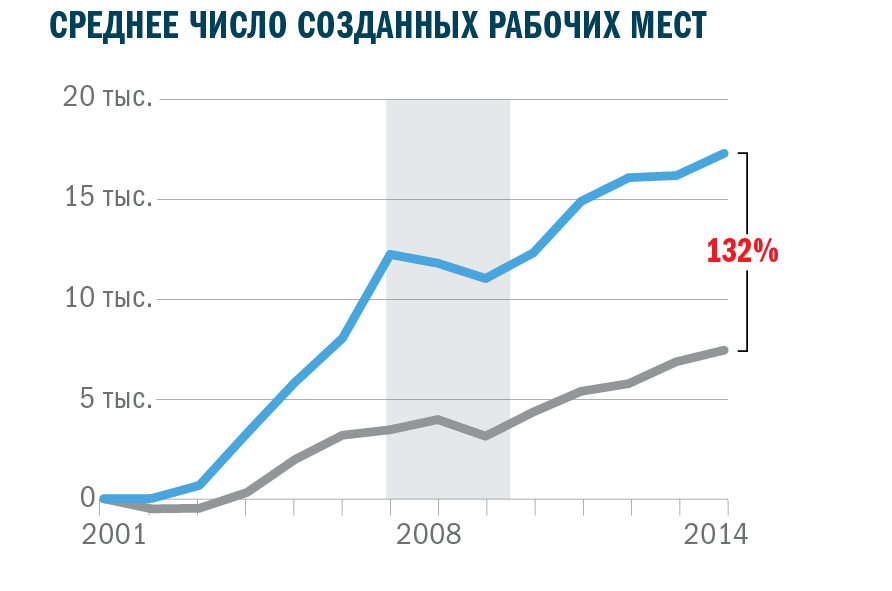 Обратите внимание, этот график уже по 15 год, а шкала в российской версии осталась прежней. Ай-ай-ай. Данные просто обрезали, а почему? Кроме того, в англоязычной версии есть мелочи, которые позволяют лучше понять графики. Подпись "annual cumulative jobs added", то есть значения за все годы суммируются. И "starting employment" — начальный уровень количества рабочих мест. Так становится понятно, почему в определенный момент график уходит ниже нуля. Дополнительному пониманию способствуют знаки плюсов перед подписями на шкале.
