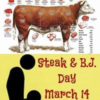 Steak and Blowjob Day (sometimes Steak & BJ Day or Steak and Knobber Day[1]) is a satirical unofficial holiday[2][3][4] created in the United States as a male response to Valentine's Day and celebrated a month later, on March 14.[5] On the day, women are purportedly supposed to cook a filet steak for and perform fellatio on a man in response to cards, chocolate and flowers given by men on Valentine's Day.[6][7]