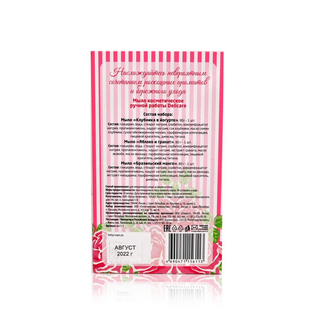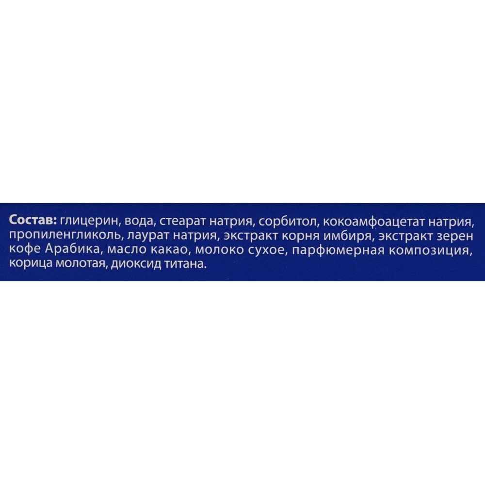 Состав: вода, пропиленгликоль, глицерин, лауретсульфат натрия, стеарат натрия, сорбитол, лаурат натрия, хлорид натрия, динатрия лауретсульфосукцинат, пигментов, тетранатрия ЭДТА,