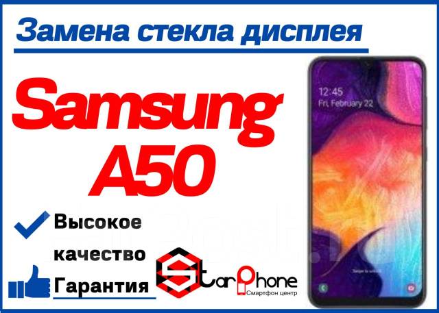 На смартфоне Samsung A50 повреждено защитное стекло: повреждено защитное стекло, необходима замена защитного стекла экрана телефона с диагональю в 6,2-дюйма, среднее время замены стекла - 10 мин .