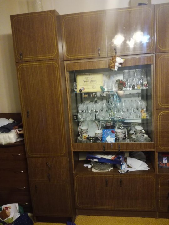Бывшая советская «стенка» может вместить немало вещей . . . не увидела я на фото даже намеков,что это переделано из старой советской мебели .Вот хрусталь сфотографирован советский .