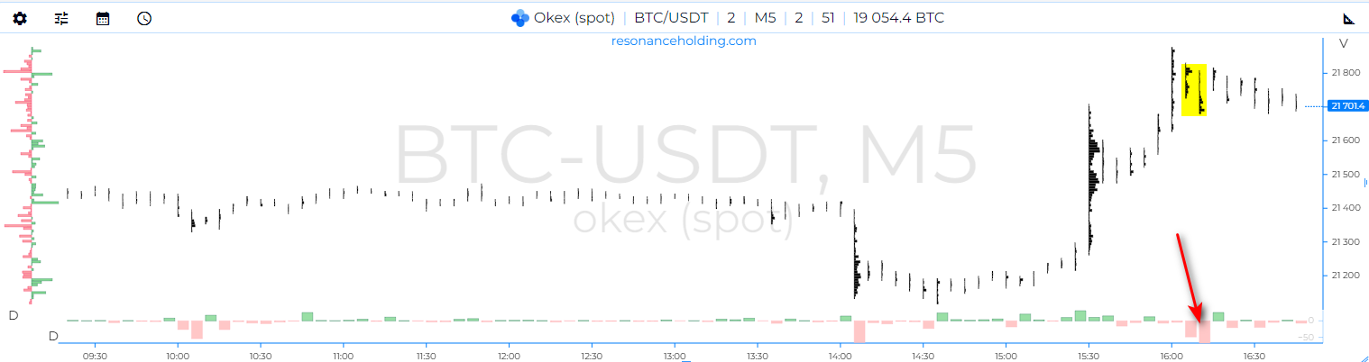 Далее снова рост на котором я думал, что меня выбьет еще раз, но обратите внимание какие потом объемы зашли в продажи и снова это произошло вверху "боковика". На этом этапе я открыл еще один шорт и смог взять хорошее движение в районе 5%.