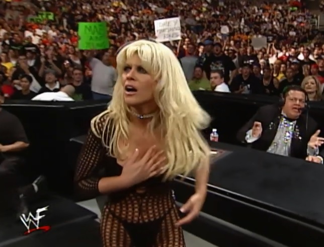 Rikishi readies for the stinkface when Chyna comes in but Rikishi catches her and Chyna starts begging off . That allows Eddie to dropkick Rikishi from behind but that causes Rikishi to squash Chyna in a corner . . . . Albert whips Bubba but Bubba ducks a clothesline and hits his version of a Diamond Cutter for the three . . . . Terri crawls under Kat . . .