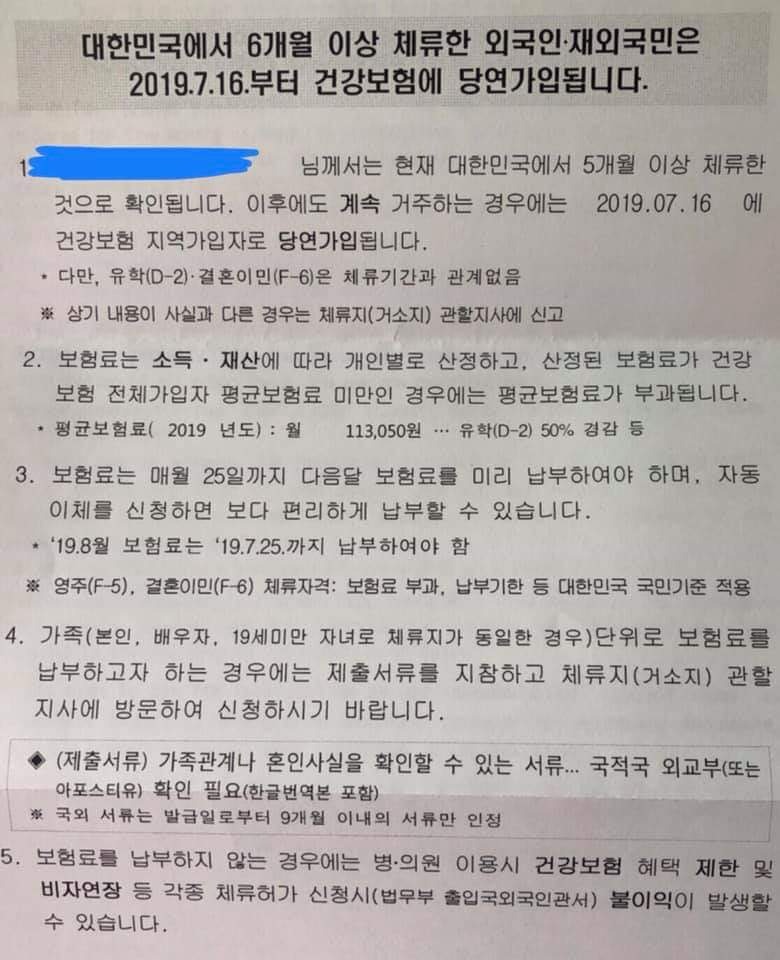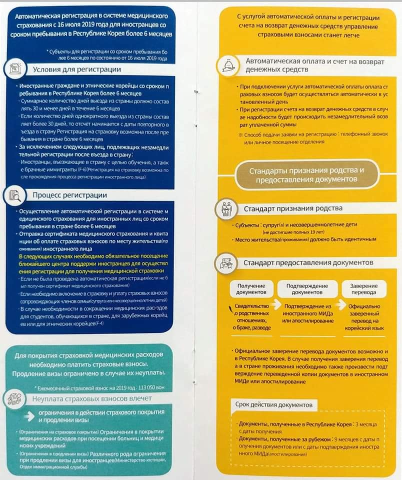 Любой иностранец или зарубежный соотечественник, пребывающий в Корее от 6 месяцев и выше, обязан оплачивать Национальное страхование здоровья с 16 июля 2019 года.