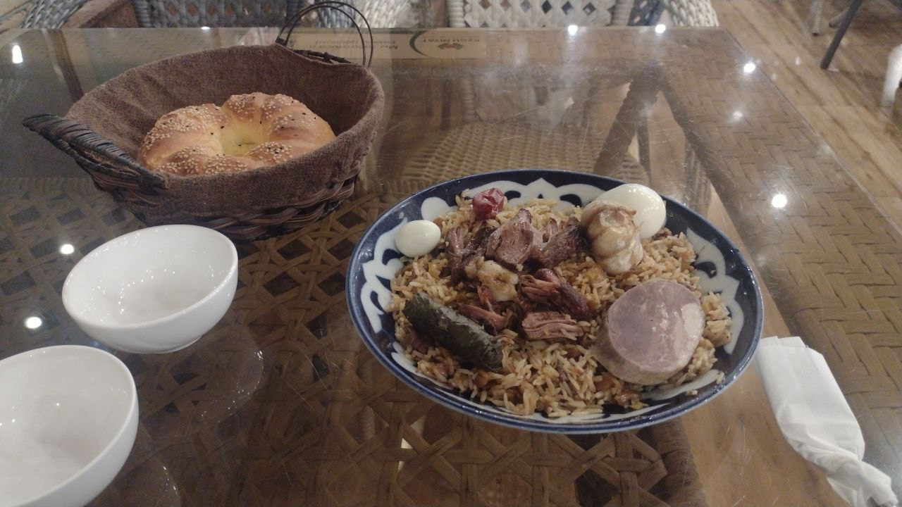 4. Такси до "Мир Плова" по рекоммендации местных жителей. Водитель волнуется, что уже поздно и плов могут не готовить, поэтому он выходит со мной из машины и ведет к казанам, чтобы проверить что все работает. Видит два горящих казана и говорит, что все хорошо, после чего показывает как заказать плов и где оплатить прежде чем поехать домой ужинать.