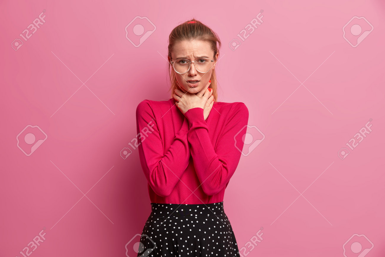 A choking feeling in a person's throat . Having the feeling of being strangled . A swollen neck . Feeling as if something is pushing or applying pressure to the space below the Adam's apple .