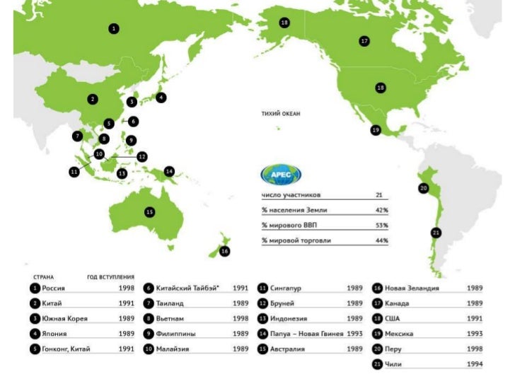 Страны-участницы АТЭС: Австралия, Бруней, Канада, Индонезия, Япония, Республика Корея, Малайзия, Новая Зеландия, Филиппины, Сингапур, Таиланд, США, Китайский Тайбэй (Тайвань), Гонконг (Китай), Китайская Народная Республика, Мексика, Папуа — Новая Гвинея, Чили, Перу, Россия . . .