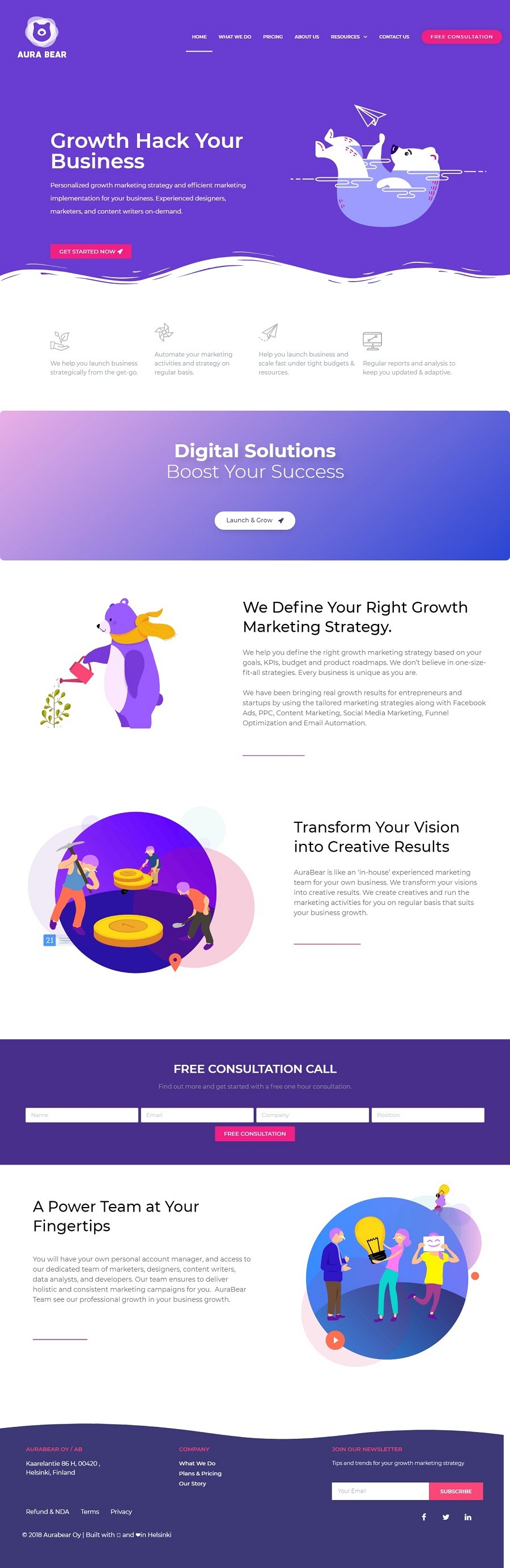 We are a design and marketing agency in Helsinki. We help SaaS companies, game studios and SMEs growth hack their business by providing marketing and advertising strategies and activities. We help companies develop strategic growth plan from the early stage.