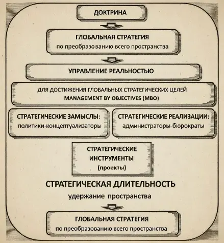 - Strategic realization — execution of the project, mobilising large-scale forces to generate a new reality.