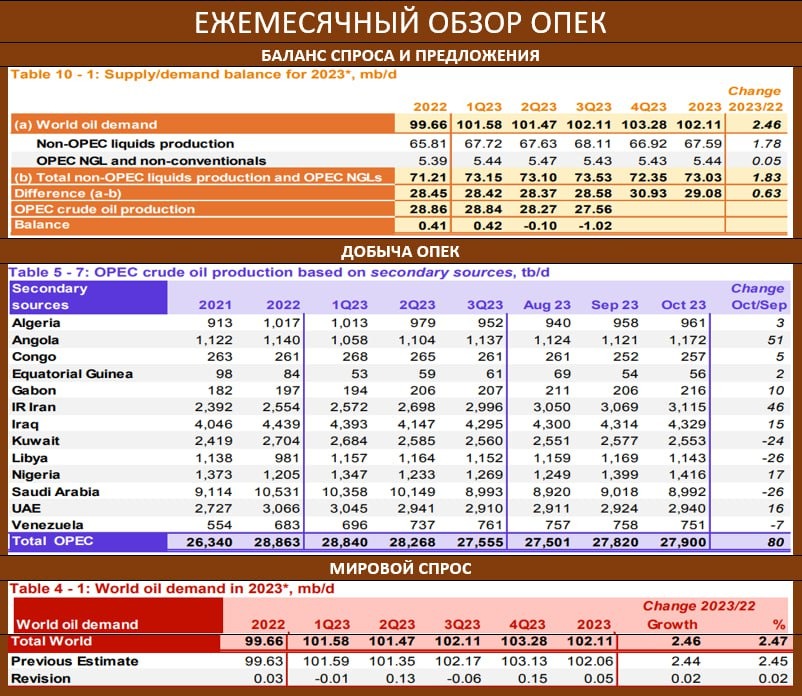 В опубликованном сегодня ежемесячном обзоре ОПЕК были повышены оценки глобального спроса в 2023г в 102.06 млн бс vs 102.01 млн бс. в сентябре. В 2024 году ожидаемый спрос составит 104.36 млн. бс (+2.25 млн бс).