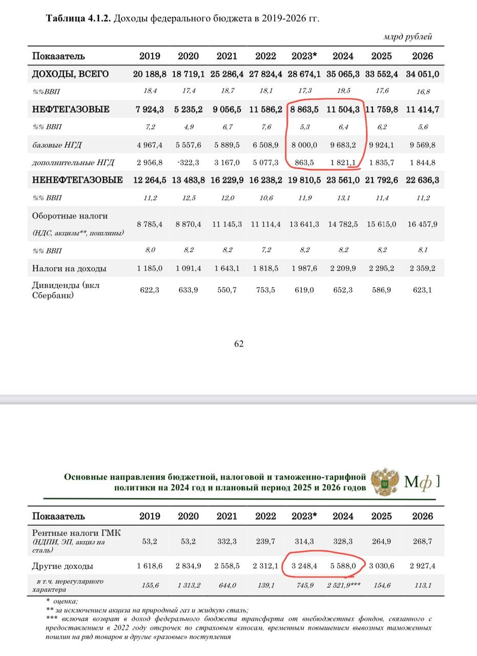 - Рост нефтегазовых доходов (налогов с нефтянки) на 30% до уровня 2022 года (когда был экстраналог с Газпрома).
