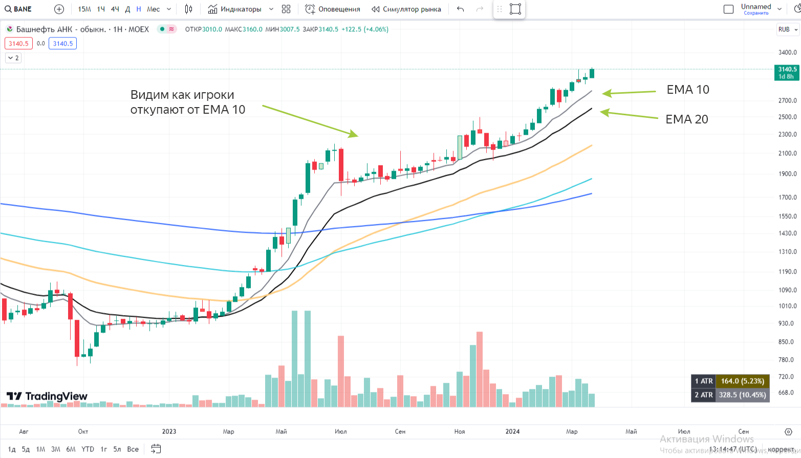 1️⃣Первый индикатор и основной это EMA, или скользящие средние. Индикатор справедливой цены, показывающий начало или затухание тренда. Показывает нам среднюю "справедливую" цену. За основу мы взяли ЕМА 10/20, которые показывают качественный рост. А главная наша задача - забрать этот самый рост.