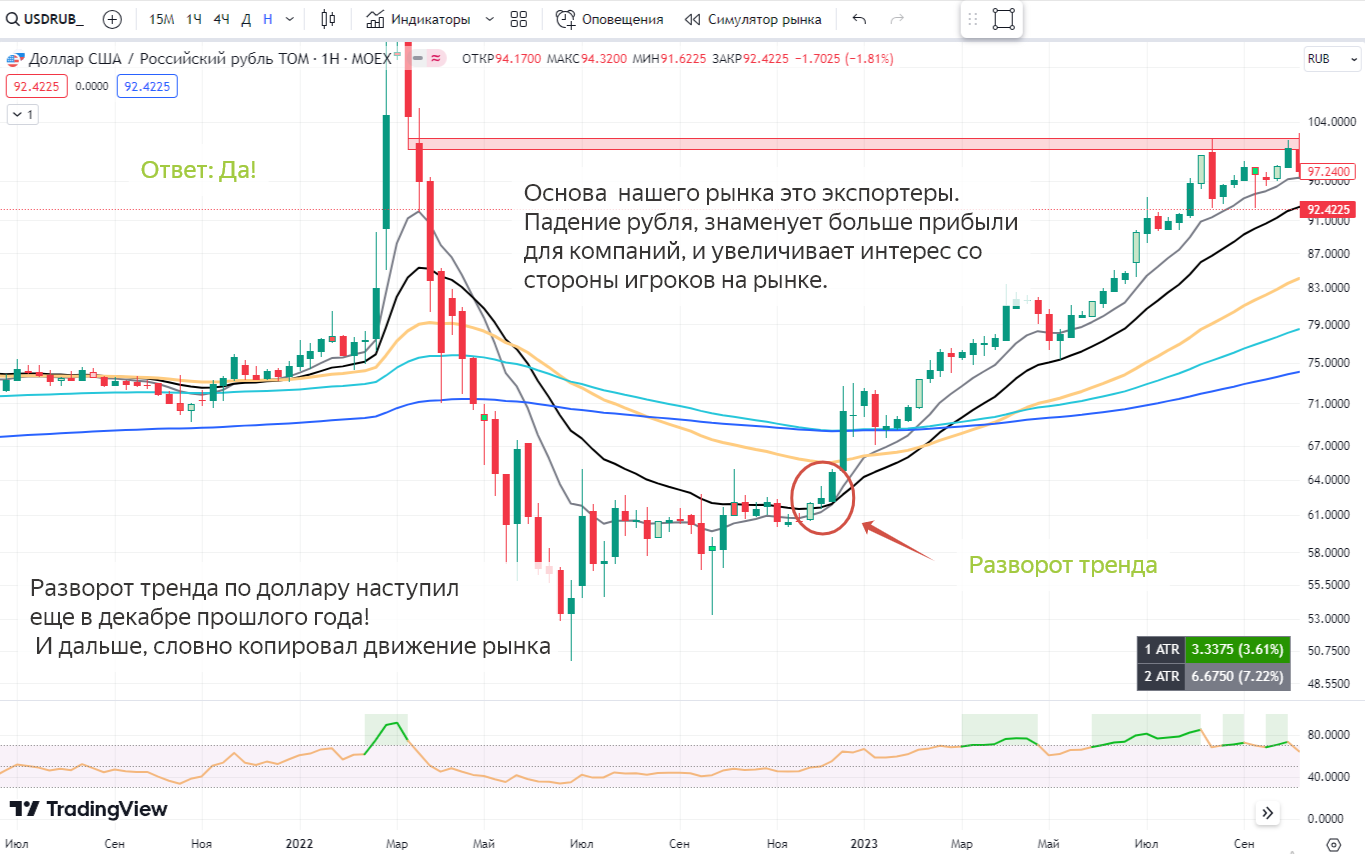 Пример №2. Как валютная пара USDRUB дала нам сигнал на разворот рынка?