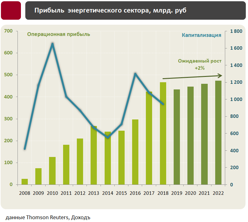 В этот год сектор энергетики должен выйти на свой максимум, показав высокий уровень рентабельности, денежного потока и дивидендов. Это объясняется окончанием инвестпроектов и максимумом выплат по ДПМ. После этого в отрасли наступит новый цикл, который потребует от компаний новых инвестиций в модернизацию, что в перспективе нескольких лет сделает отрасль неинтересной для инвестиций.