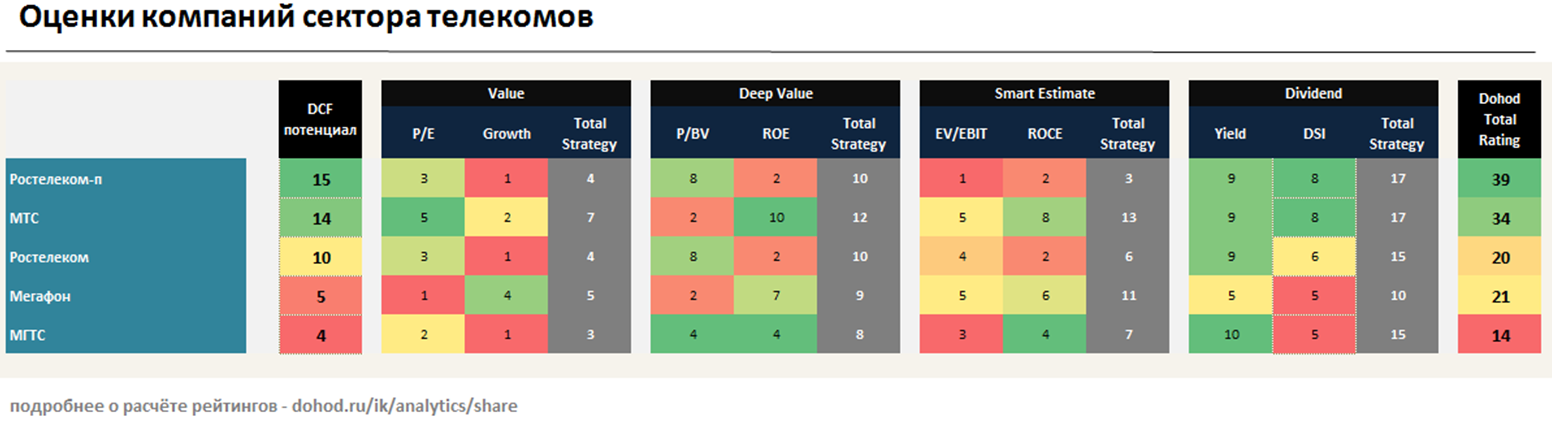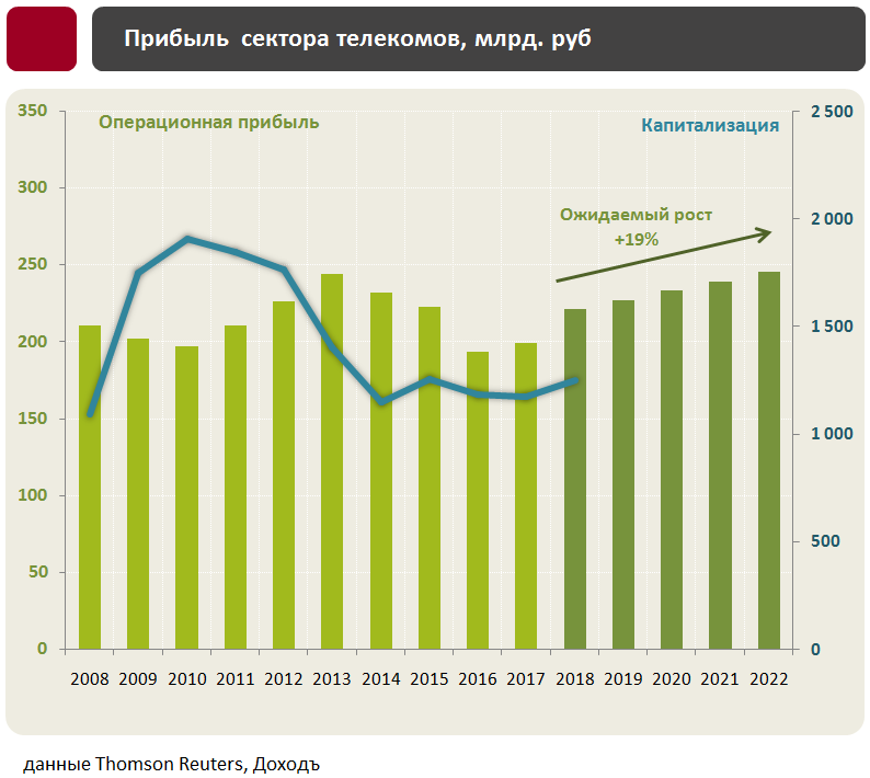 Из-за отсутствия перспектив роста, сектор телекомов представляет собой интерес в основном с точки зрения дивидендных стратегий. Компании, в основном, платят большую часть свободного денежного потока на дивиденды, что формирует ожидаемую дивдоходность выше рыночной. Угрозой для отрасли является необходимость исполнения "закона Яровой", который заставит компании увеличить инвестиции в инфраструктуру и ограничить дивидендный потенциал. Отметим, что по мультипликаторам сектор оценен дорого и имеет относительно низкую рентабельность.