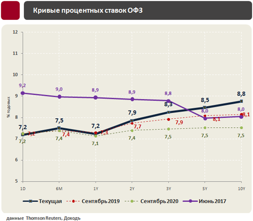 Паника инвесторов из-за санкций и ожидания ускорения инфляции привели к снижению стоимости облигаций и росту процентных ставок на долговом рынке. Мы считаем, что реакция рынка облигаций была избыточной - долгосрочные ставки на кривой ОФЗ в течение года могут снизиться на 0,4%-0,7%. Наш прогноз кривой относительно июля практически не изменился.