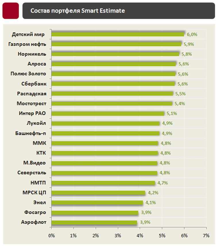В портфель выбираются 15-18 компаний, которые имеют наибольший рейтинг по стратегии "SmartEstimate". Итоговая доля зависит от потенциала по DCF-модели. В случае слишком низкого рейтинга компания, проходя первичный отбор, может в итоге не попасть в финальный портфель.