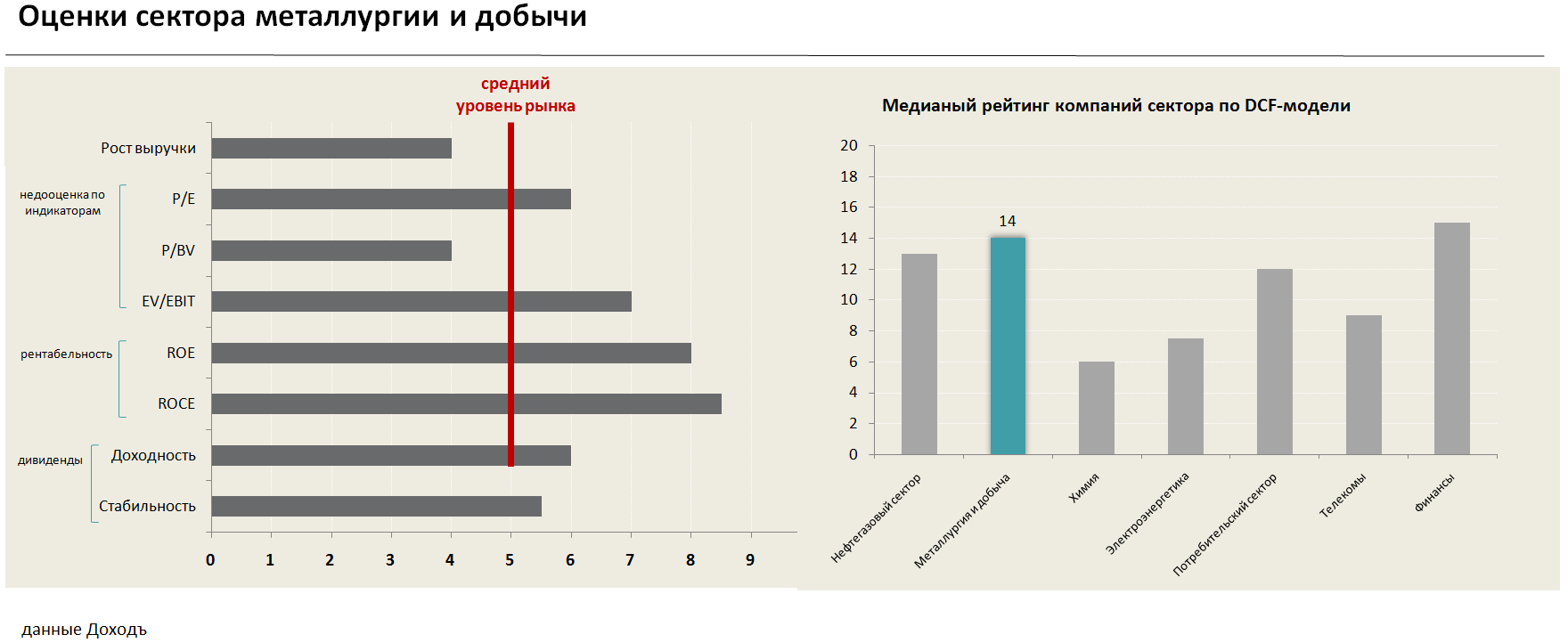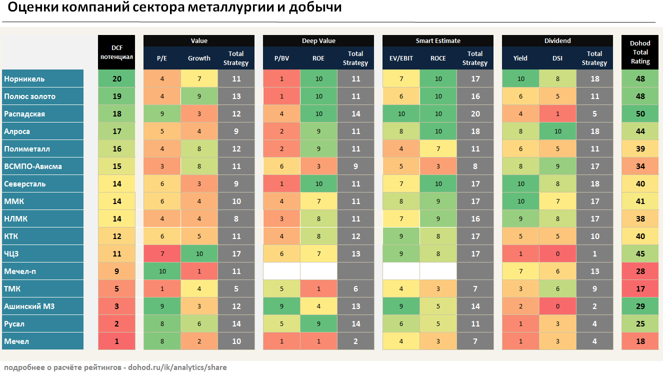 В базовом сценарии мы предполагаем, что отрасль избежит дополнительного регулирования, что может вызвать положительную переоценку стоимости её акций. Мы предполагаем, что долгосрочные перспективы роста выручки сектора хуже, чем у рынка, однако дешевизна по мультипликаторам, высокая рентабельность и хорошая ожидаемая доходность делают металлургию одним из лидеров по среднему рейтингу потенциала в наших DCF-моделях.