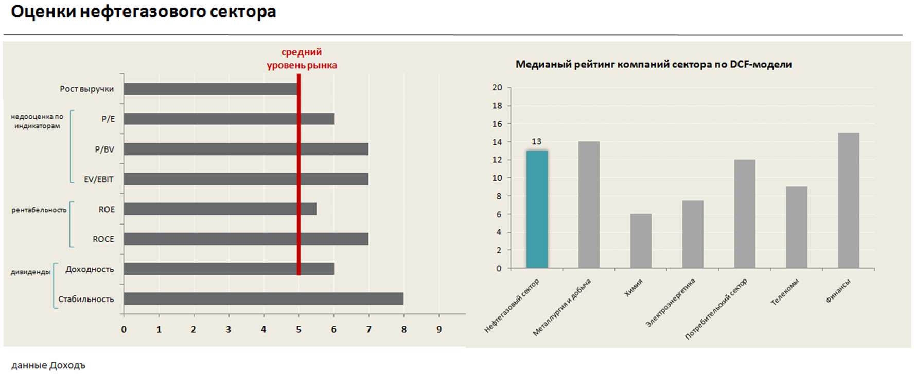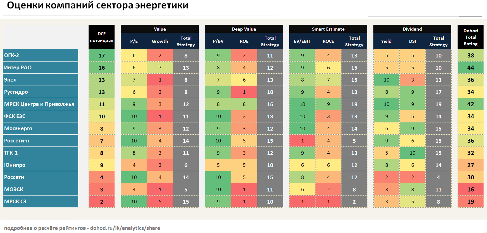 Сектор стоит дешево по мультипликаторам, однако это не должны вводить в заблуждение - через несколько лет свободный денежный поток отрасли может вновь вернуться к отрицательным отметкам. Учитывая это, логичным выглядит невысокий медианный рейтинг энергетики по DCF-моделям относительно других отраслей.