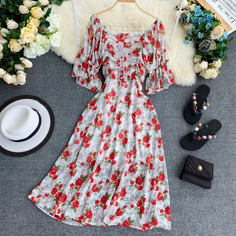 Floral Dress Niche Short Sleeve Dress Fried Street Sweet Spicy Wind Open Back Dress Summer 2022 New Waist Style