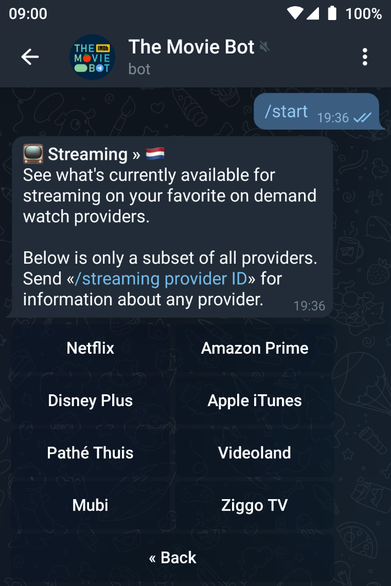 Cinegram ChannelTo see what's currently available on your favorite watch providers, you can use the Streaming menu or the command /streaming providerID (or its shortcut, /s). Almost all streaming services, from 35+ countries, are supported by Cinegram, but not all are featured in the Streaming menu — it would be a very big menu.