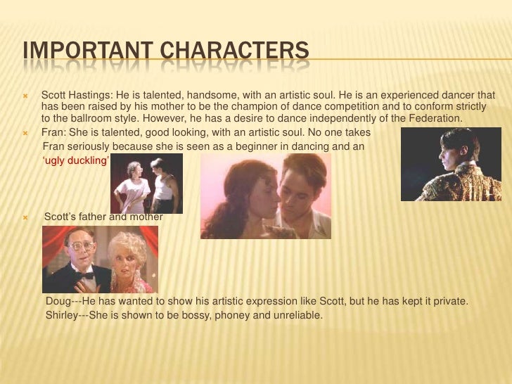 Strictly Ballroom Essay Example . However it is through Scott's reaction "Maybe I'm sick of dancing someone else's steps all the time" that foreshadows his struggle between his individuality and the forced conformity of the dance culture and Barry Fife . Scott's rebellion is shown when he partners up with 'ugly duckling' Fran for . . .