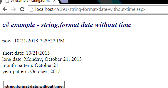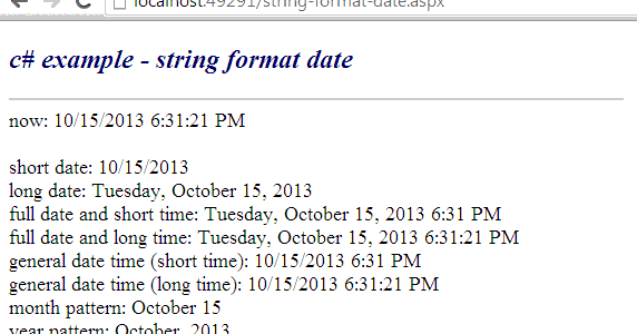 Here are some examples of custom date and time formatting: [C#] String . Format ( " {0:M/d/yyyy}", dt); String . Format ( " {0:MM/dd/yyyy}", dt); String . Format ( " {0:ddd, MMM d, yyyy}", dt); String . Format ( " {0:dddd, MMMM d, yyyy}", dt); String . Format ( " {0:MM/dd/yy}", dt); String . Format ( " {0:MM/dd/yyyy}", dt);