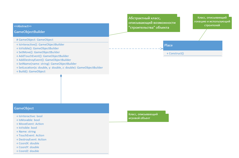 Класс GameObjectBuilder задаёт методы для заполнения полей игрового объекта: