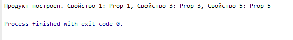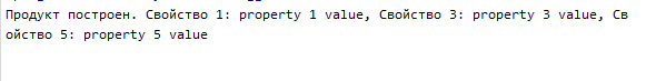 Console.WriteLine($"Продукт построен. Свойство 1: {product.Property1}, Свойство 3: {product.Property3}, Свойство 5: {product.Property5}");