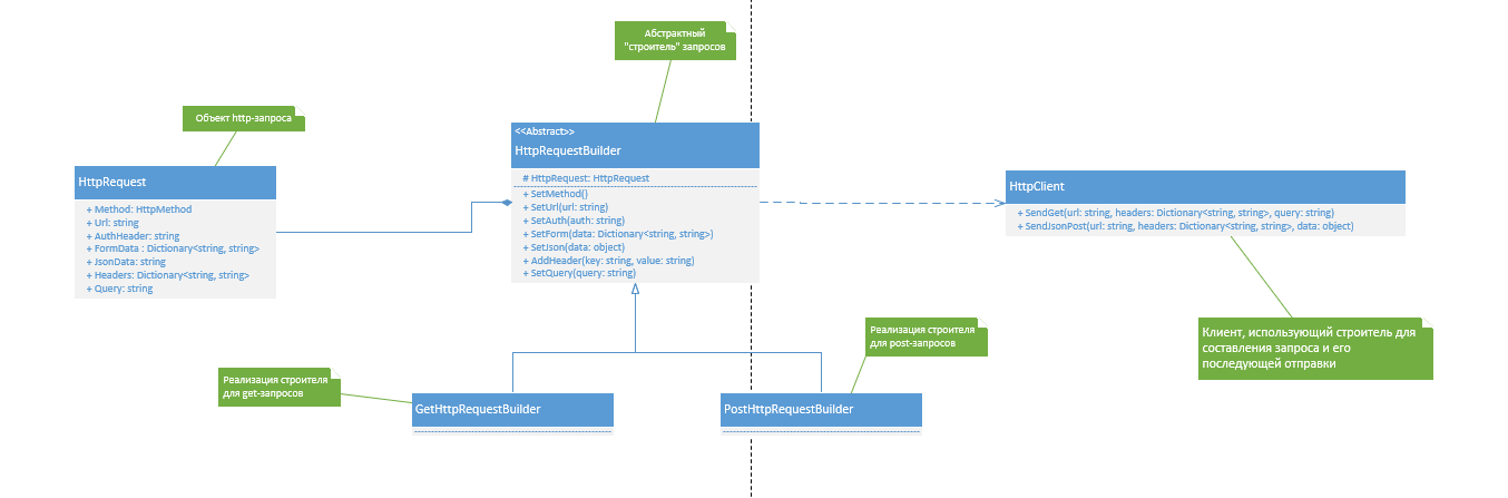 - Абстрактный класс Builder описывает методы, с помощью которых можно построить продукт, но не реализовывает их: