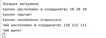 Console.WriteLine($"Кролик расположен в координатах {bunny.CoordX} {bunny.CoordY} {bunny.CoordZ}");