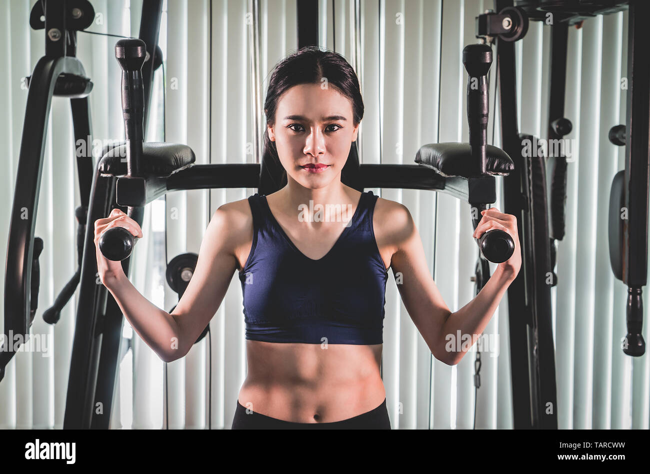 Strong asian woman posture standing and lifting up her arms and Strong asian beautiful female exercise with dumbbell,Female in sportswear does the exercises at gym . Strong asian beautiful woman exercise with dumbbell,Female Strong muscular asian man lifting weights exercise his breast in fitness gymnasium,sport and healthy concept .