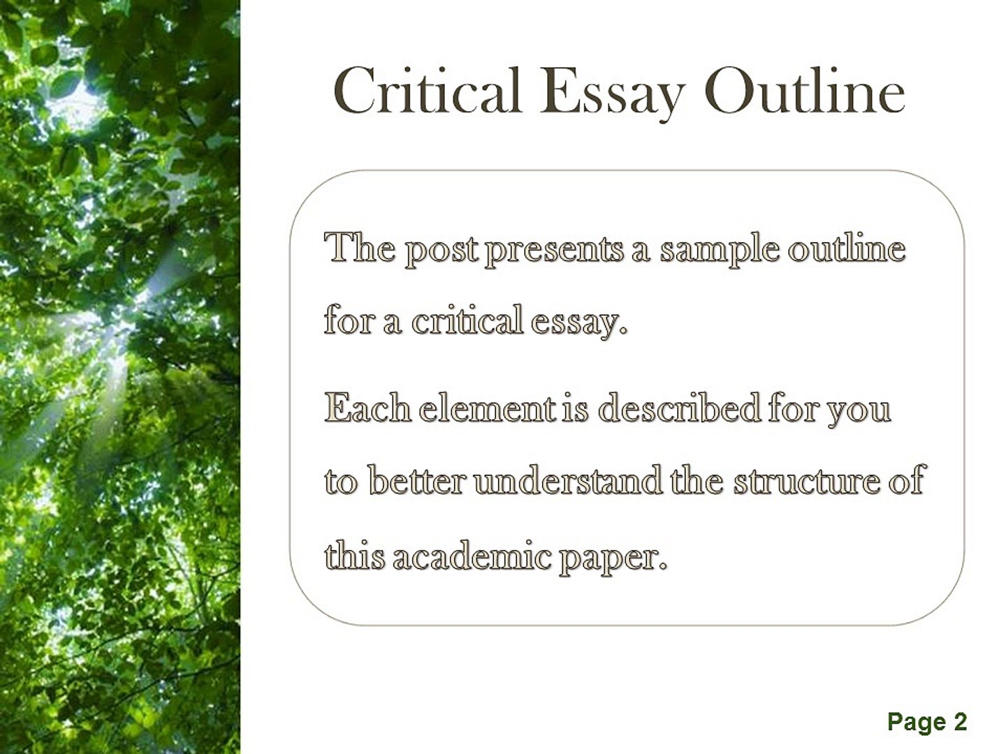 Critical Essay Outline . A critical essay is a bit tricky as you have to analyze and explain a piece of writing or cinematography but if you know the outline and tips to write the essay , it won't be difficult for you anymore . A critical essay must have five paragraphs; an introductory paragraph, the body paragraphs, and the conclusion .