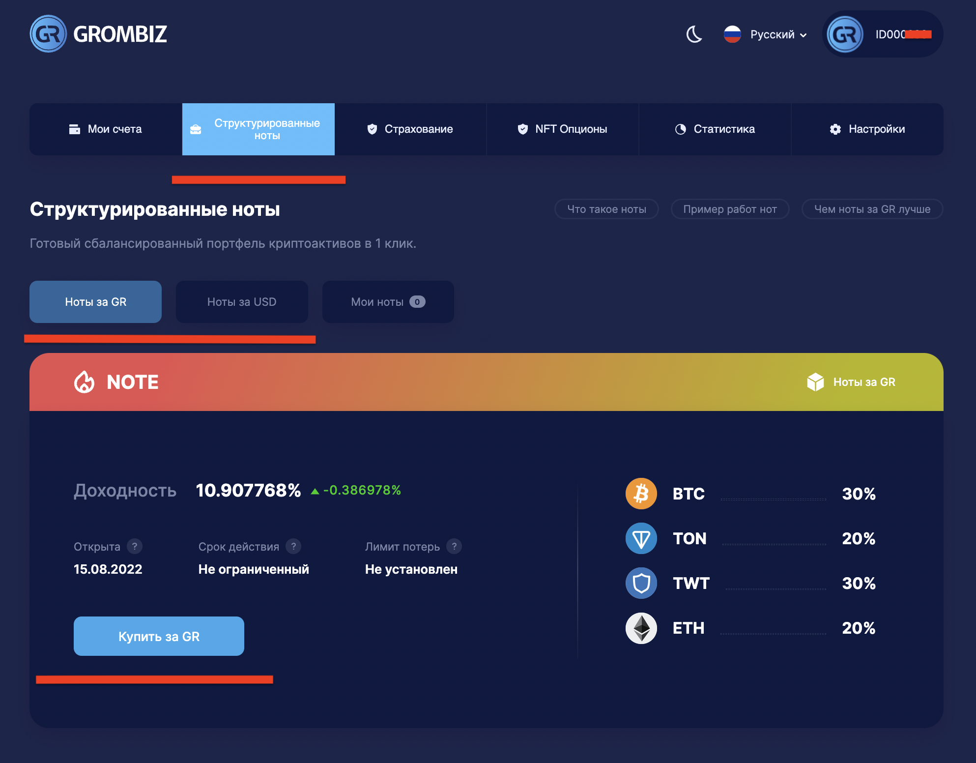 Для того, чтобы приобрести структурированную ноту, нужно перейти на страницу: https://gr.biz/account/notes и выбрать нужную ноту по вашим параметрам. На сейчас доступны ноти: Old school, TOP Altcoins, Infrastructure и нота Bullrun.